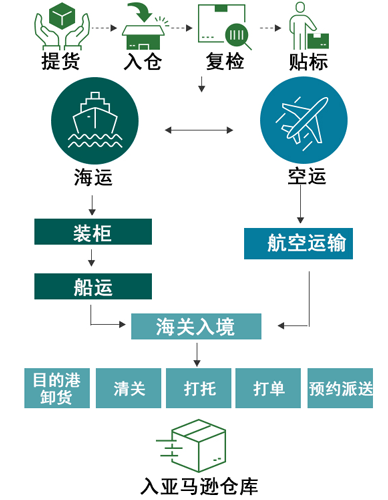 海运+当地清关+目的国派送,时效略微长点。国外派送分为:卡车派送和快递公司派送。主要区别在派送时间上,拖车送去亚马逊,一般需要入库预约,操作比快递麻烦。但是价格便宜